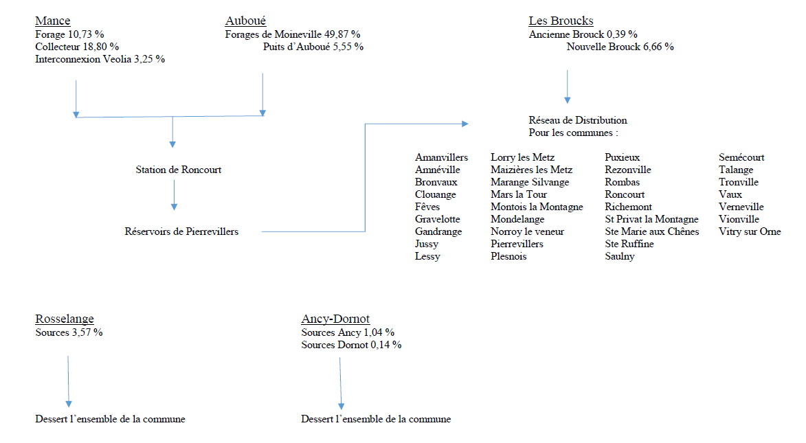 - Il dispose de différentes ressources en eau dont les plus importantes sont les forages de Moineville et les sources de la Mance qui représentent environ 85% des prélèvements totaux annuels.
